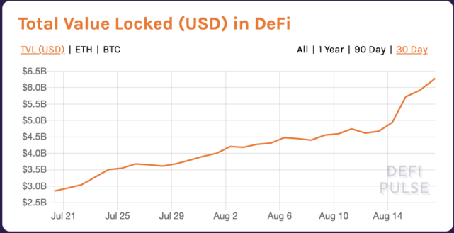 DeFi从吹起风口,到成为风暴,仅仅用了一个多月时间。而DeFi总锁仓量在不到 3个月时间翻了 6倍,8月 14 日,DeFi协议总锁仓量已经突破 60亿美元。