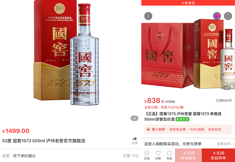 除官方平台外,线上某经销商店铺该产品仅售价999元,拼多多平台某店铺内该产品拼团价为919元。由此可见除官方店铺售价均突破千元外,其他平台或经销商店铺,国窖1573价格仍难破千元大关。