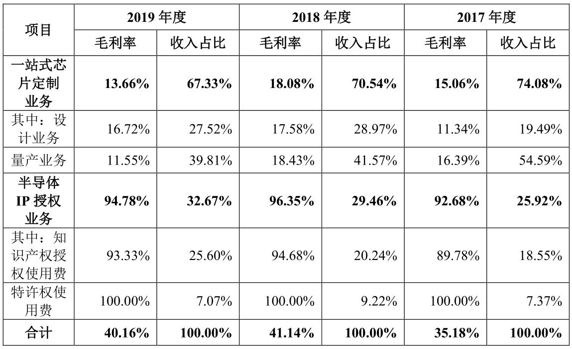 其中,一站式芯片定制服务可分为芯片设计和芯片量产业务,芯片设计覆盖交付给客户芯片样片前的环节,量产业务则是为芯片量产提供生产管理服务,这两项业务毛利率都较低;芯片IP授权业务则分为授权使用费和特许权使用费,这两项业务毛利率普遍在90%以上。