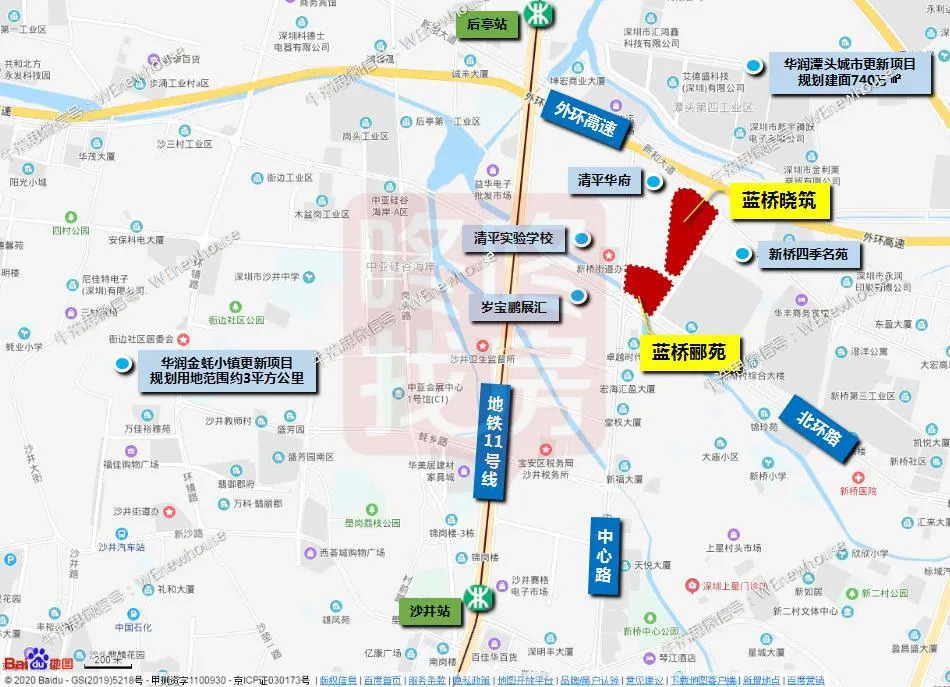 两项目位于新桥街道沙井中心路及沙井北环路交汇处的东北侧,紧邻太隆城购物中心及大型统建楼景城花园;另清平华府和新桥四季名苑两建设中的新盘住宅项目亦在其两边。