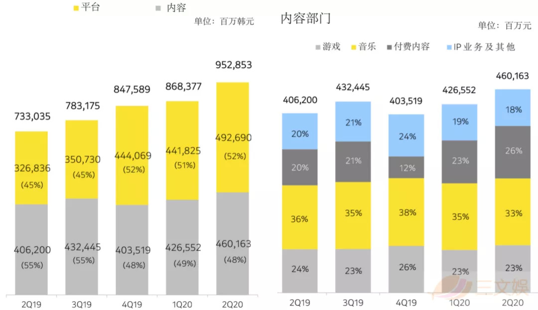 在内容部门里,音乐部门的收益以占比33%位居首位,其次是付费内容部门占比26%,之后是游戏(23%)、IP业务及其他(18%)。