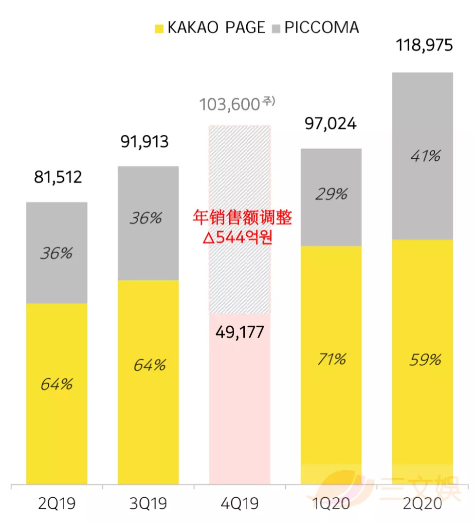 值得一提的是,在2020年第二季度Piccoma的交易额同比增长了2.5倍,实现了2.86亿元(488亿韩元)的销售额,为付费内容的销售额增值做出了巨大的贡献。而在2020年第一季度,Piccoma营收1.6亿元人民币(281亿韩元)。换言之,Piccoma在2020年上半年的总销售额约为4.5亿。
