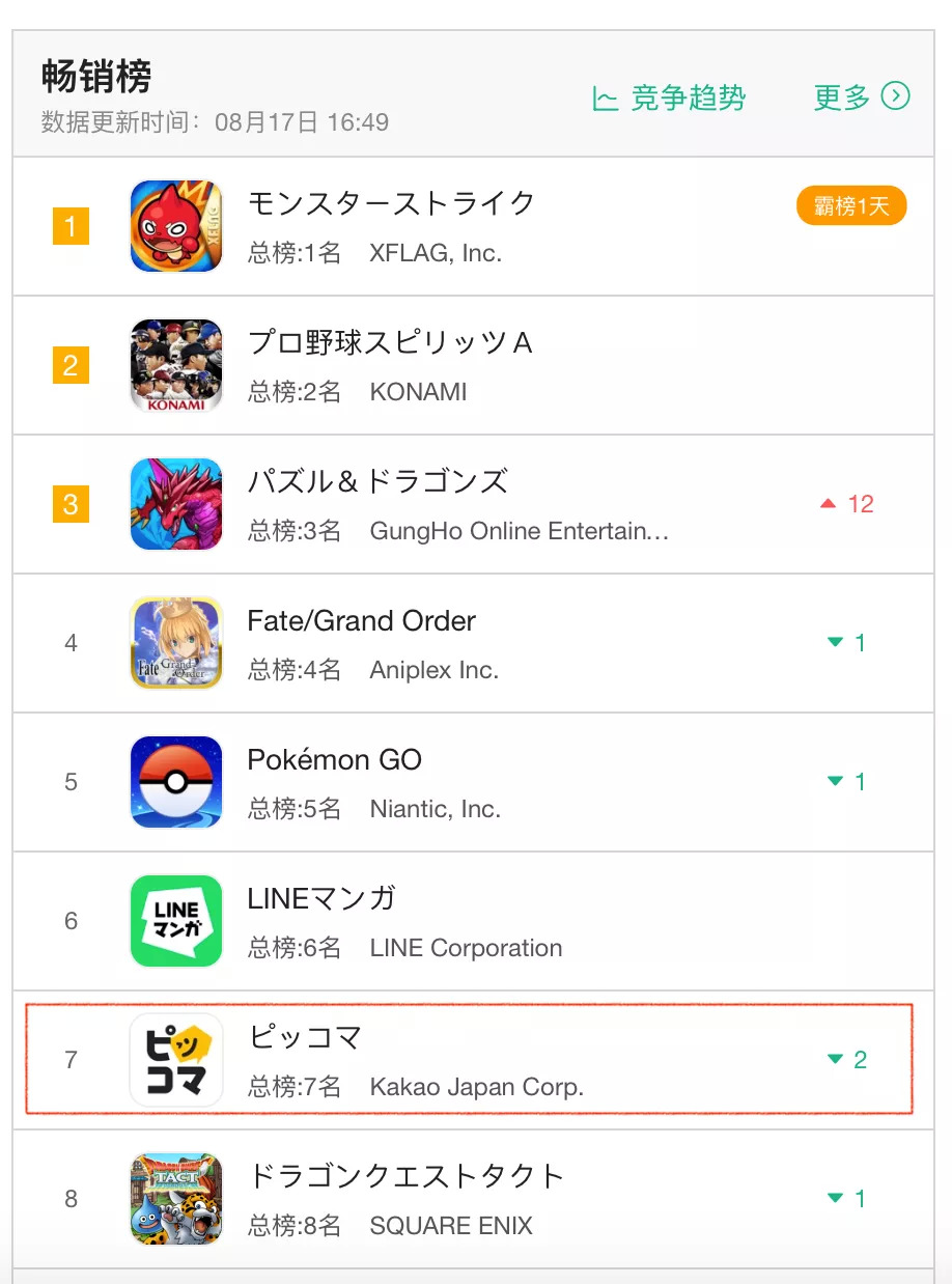 Piccoma是Kakao japan旗下网络漫画平台,2016年在日本推出,目前已成为最受日本用户欢迎的平台之一,APP下载量近2000万次。目前,在日本App Store畅销总榜,Piccoma稳居Top10,与一众游戏产品比肩。