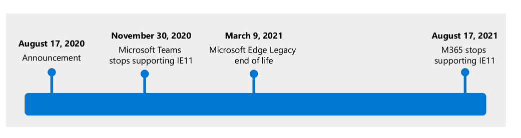 2021年8月17日起,IE 11浏览器将不再支持微软旗下包括Office365,OneDrive云盘,Outlook邮箱等办公软件服务。微软还将在2020年11月30日停止对旗下视频会议软件Teams的IE 11浏览器支持。
