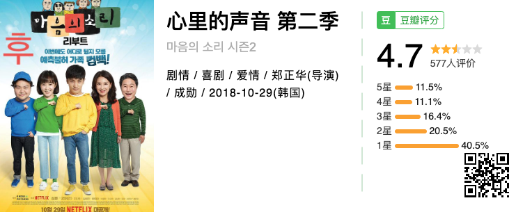 最近一次表演续作评分大跳水的韩剧作品是根据搞笑韩国漫画改编的电视剧《心里的声音》,第一部主演是因为综艺节目而被中国观众熟知的韩国演员李光洙,第二季换成了别人,两部作品的评分差距就像两任男主角的身高差距。