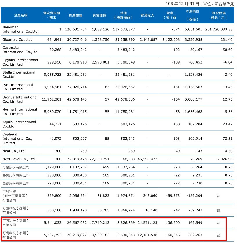 可成科技年报显示,2019年可胜科技和可利科技的本期损益分别为1.69亿新台币和2.63亿新台币。