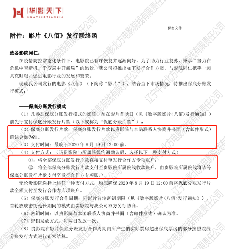 从燃财经获得的辽宁中影北方电影院线收到的《影片《八佰》发行联络函》里,可以看出此次保底发行的一些规则。联络函中写明,保底金额需单独与工作人员洽谈,且明确提出了保底支付时间,最晚得在8月19日12:00前,即影院得在影片首映日前完成支付。