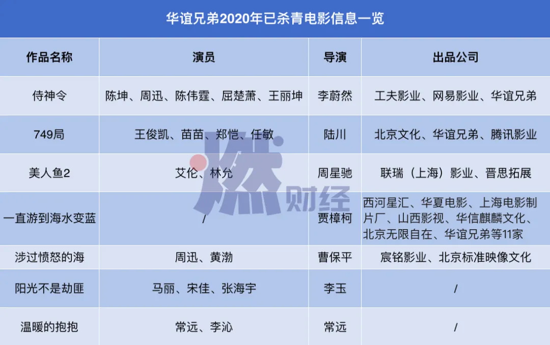 在其电影储备里,除《八佰》外,杀青进入后期制作阶段的影片还有7部。由陈坤、周迅搭档主演的《侍神令》,是存货里阵容最好的一部,已宣布在2020年内上映。不过值得注意的是,这7部影片大部分并非由华谊兄弟主投主控,能为其带来的效益恐不及《八佰》。下半年对华谊兄弟2020年财年还存有意义的大档期,仅剩七夕与国庆,再加上春节档延期的大片纷纷开始扎堆定档,竞争压力下集中上映多部影片不太现实。