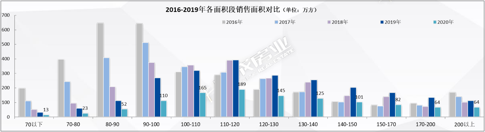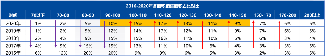 成都中成房业数据显示,2020年上半年,成都一手商品住宅以改善型产品为主。100㎡以上产品成交占比由2016年的43%上涨至今年的83%,其中,100-150 ㎡产品占比64%。而90㎡以下产品占比仅8%,其中,70㎡以下产品占比更是只有1%。