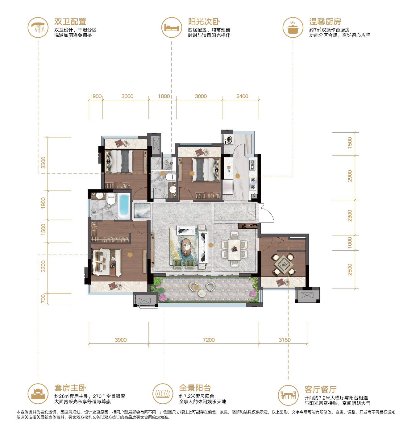 以128平米产品为例,该户型配备了长约7.2米的宽景阳台,打造全家人的休闲娱乐天地。同时,约26平米的主卧,配置L型衣帽间,加上270度全景飘窗,在保证私密性的同时,也提供了大面宽的采光。