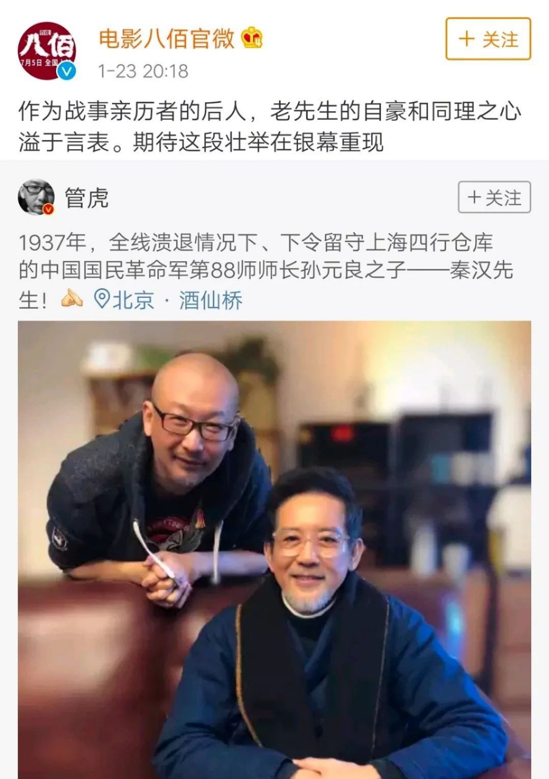 很多人回过头去才注意到,管虎在2019年1月,拜访了孙元良之子秦汉,并将合影发了微博。