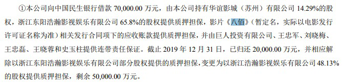 2020年一季度,华谊兄弟现金及现金等价物余额仅剩2.68亿元。而《八佰》也被华谊兄弟抵押担保给了中国民生银行,用于申请7亿元综合授信。