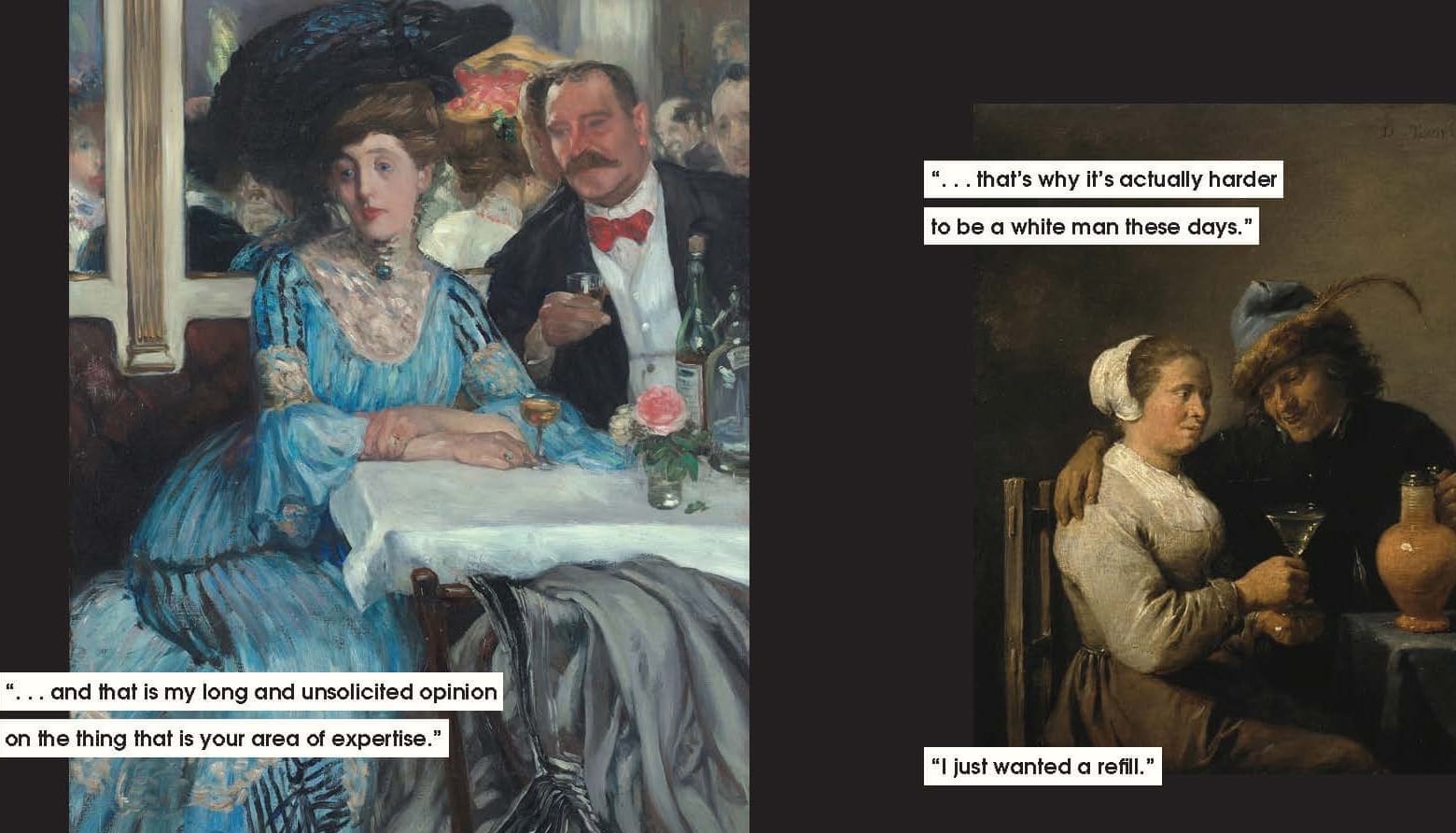 她给德国艺术家约伯斯特·哈里奇(Jobst Harrich)于17世纪创作的一幅画加上了配字——“也许,如果我把我的胸部露出来,他们就会停止向我解释我自己的笑话。”以该作品为首的系列作品迅速在网上走红。妮可·泰西尼一不做二不休,她找来了更多描绘男人和女人聊天场景的画作,作品中的女性看起来都心不在焉。她为它们加上了充满冷幽默的配字——男人们分享了对母乳喂养和月经疼痛等话题的见解。妮可·泰西尼的经纪人瑞秋·苏斯曼(Rachel Sussman)建议将该系列作品集结成册。正如妮可·泰西尼所说:“大家完全能够领会,人们想与其他能领会其中内涵并有过类似经历的人一起付之一笑。”