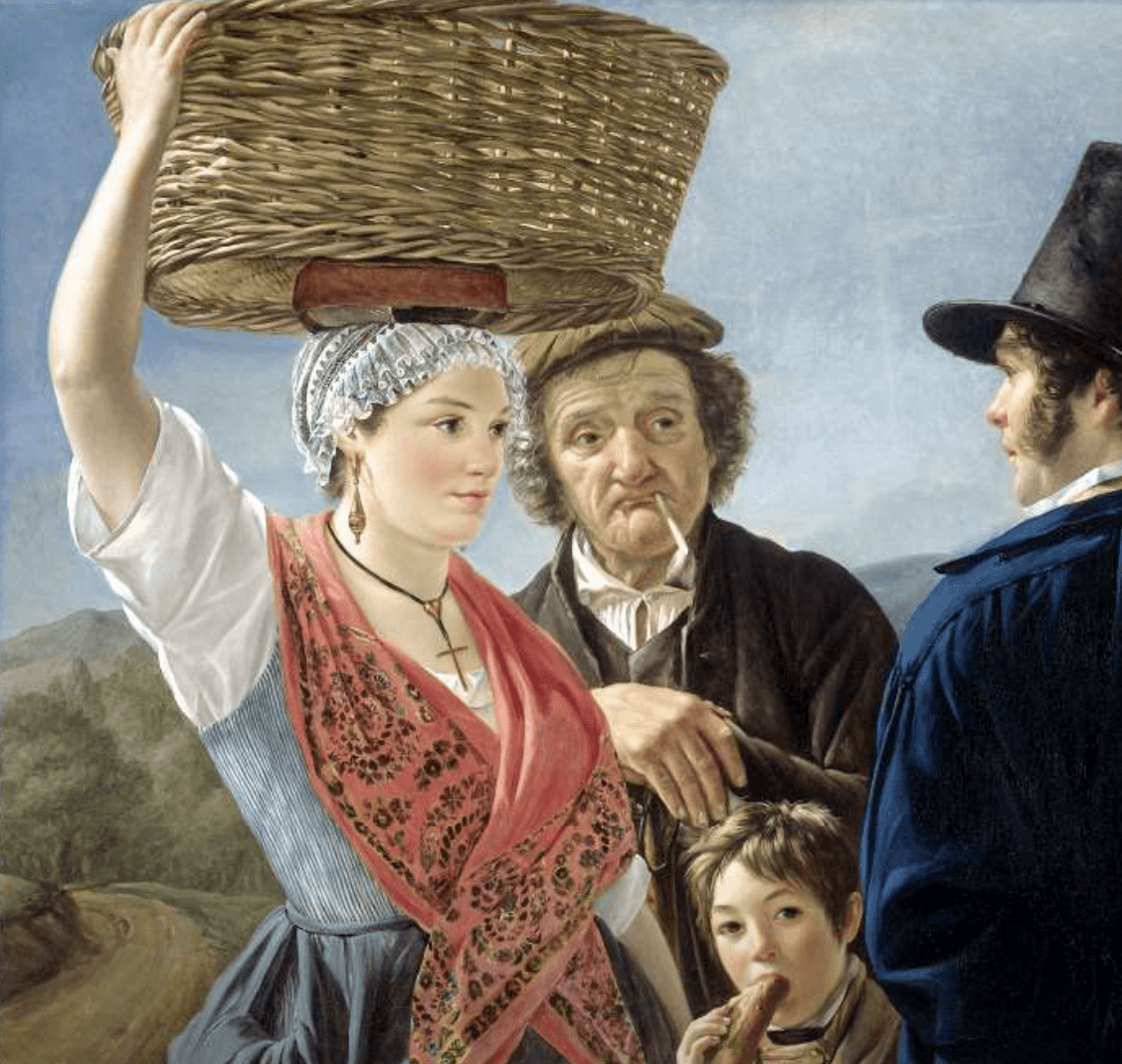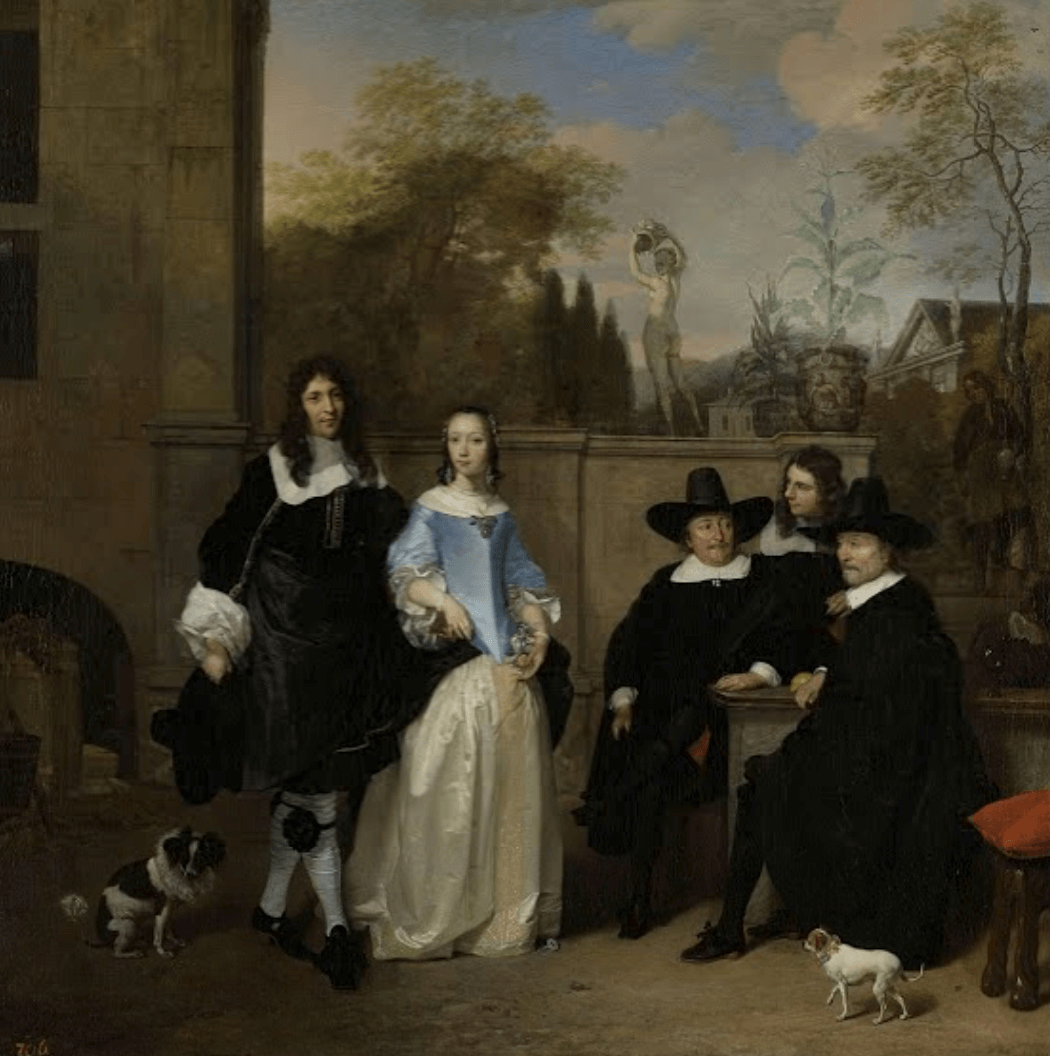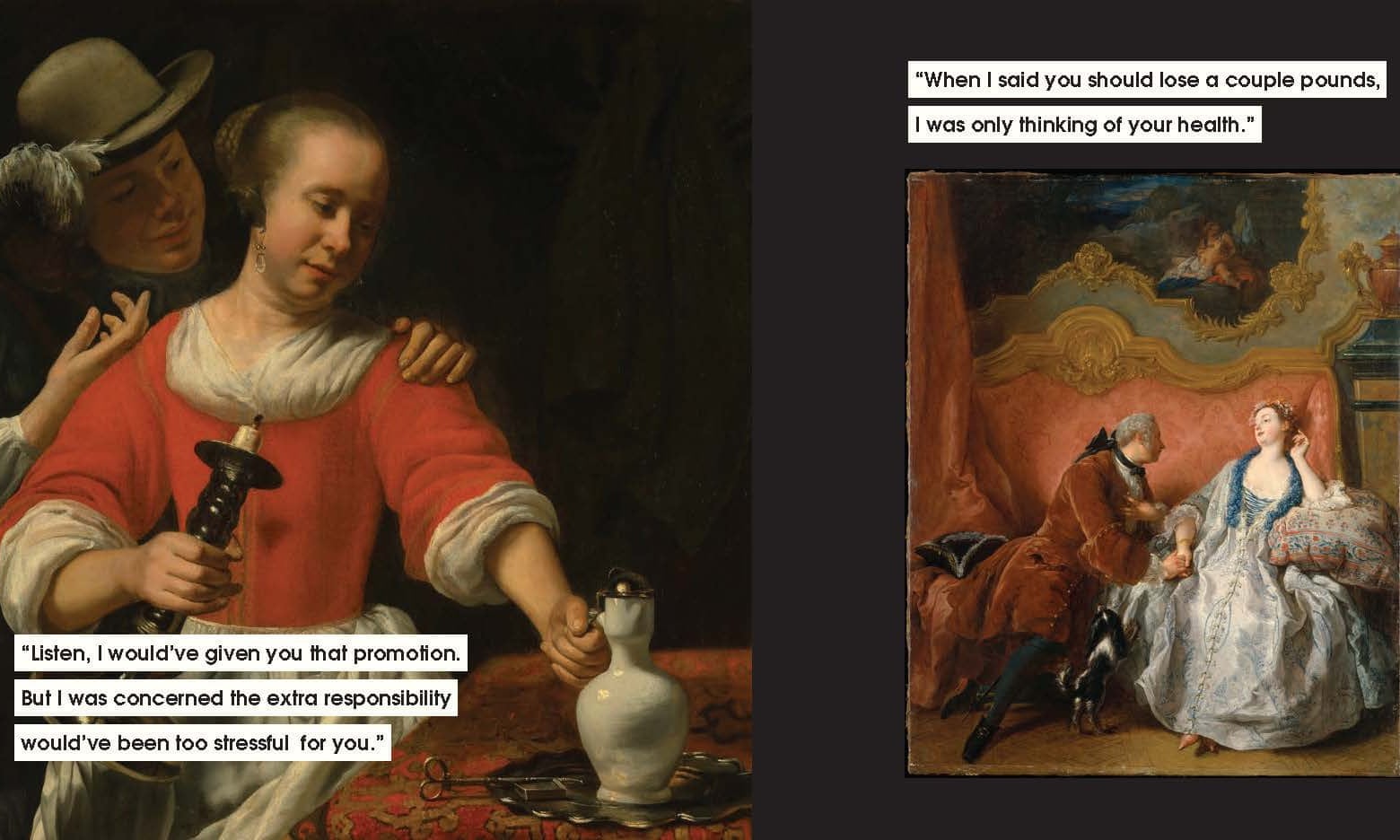 在“爱解释的男人”一章中,巴伦德·格拉特(Barend Graat)的《花园里的陪伴》(Company in a Garden,创作于1661年)展示了花园里一个身着紧身胸衣的年轻女子正被一个男人拉扯着,他们身后是一群乌合之众。拉着她男子在试图解释他们的口哨声:“你应该受宠若惊,他们是觉得你足够有魅力才会骚扰你的。” 在“高高在上的男人”一章中,让·亨利·德·科恩(Jean Henri de Coene)的《集市上的闲话》(Market Gossip,创作于1827年)中戴着高帽子的绅士对头上顶着一个大篮子的女子说:“我看得出来你很忙,但我还是得告诉你,你如果能笑一笑的话就好看多了。”