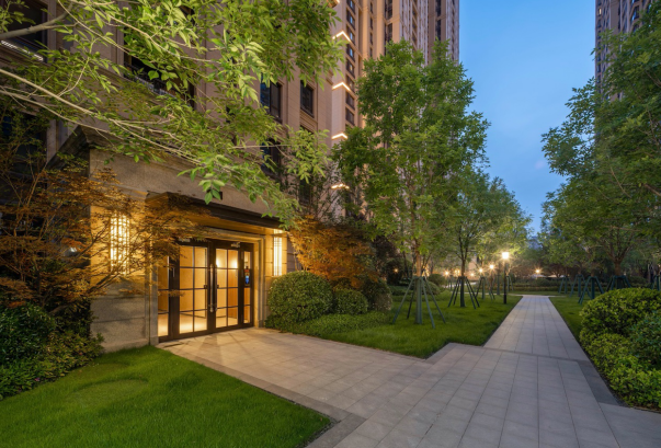 融创归家道路匠心雕琢,倾付所有美好。走在园区内采用300*1200mm长天然花岗岩石材铺贴而成的路面上,两侧种植高8米左右的行道树一路陪伴业主归家,配以红枫、紫薇、木槿、鸡爪槭、五角枫、蒙古栎、茶条槭等多种植被,郁郁葱葱,遮荫避雨,于阡陌错落间装点四季景色。同时,园区内的几方水景带来流动水域,独特的设计让目之所及,皆是生机。