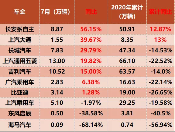 虽然车市在上半年受疫情影响较重,但自5月份起,多数车企都已开启回暖模式,7月份,有超过7家车企实现销量同比增长,更有长安系等少数车企在全年销量成绩上已摆脱疫情冲击实现同比正增长。