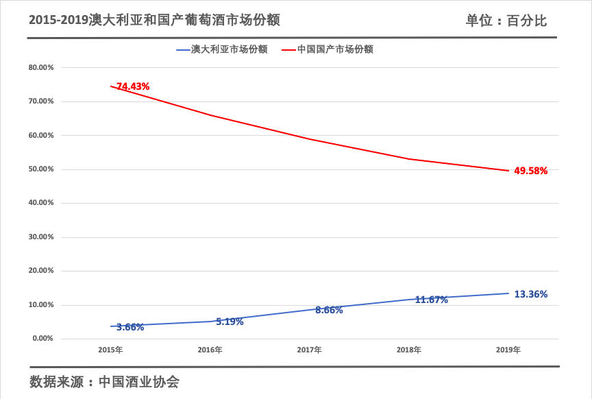 另据中国酒业协会统计,这段时间,澳大利亚进口葡萄酒占我国全部进口葡萄酒的比重从14.3%升至26.5%,在我国葡萄酒市场的份额从3.7%增加至13.4%。