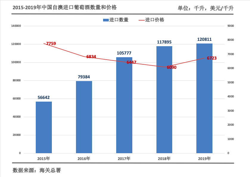 据海关总署统计,2015年至2019年,中国自澳大利亚进口的葡萄酒数量从56642千升至120811千升,规模翻番。