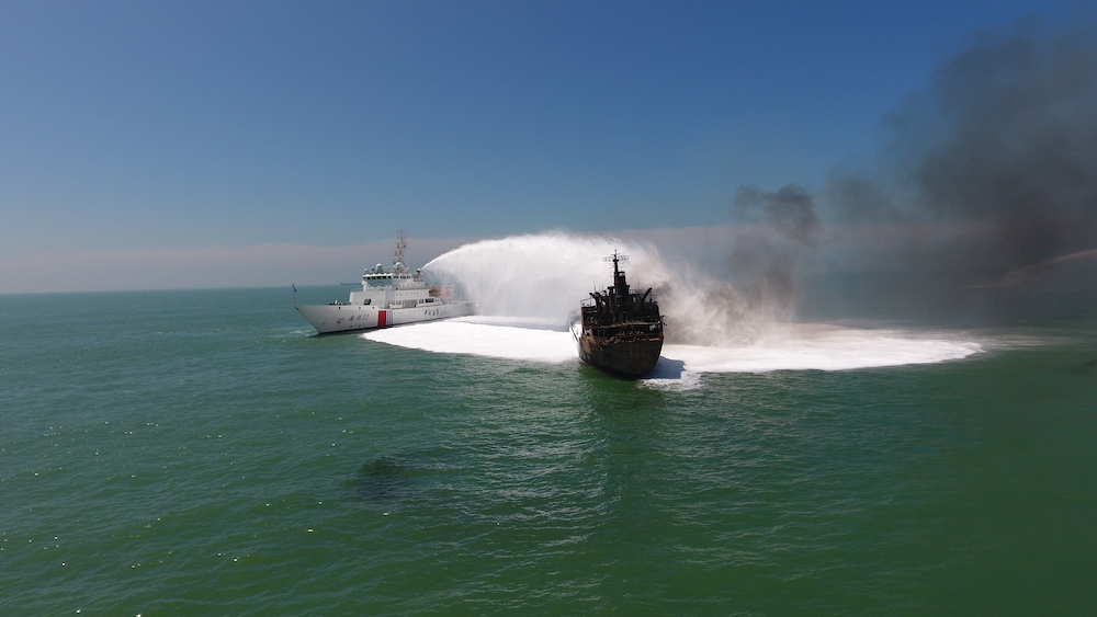 上海海事部门提供的视频显示,两船碰撞后,油船发生了火灾,燃起浓烟。救援船只在对其进行喷淋作业,救援直升机盘旋在涉事海域上空。