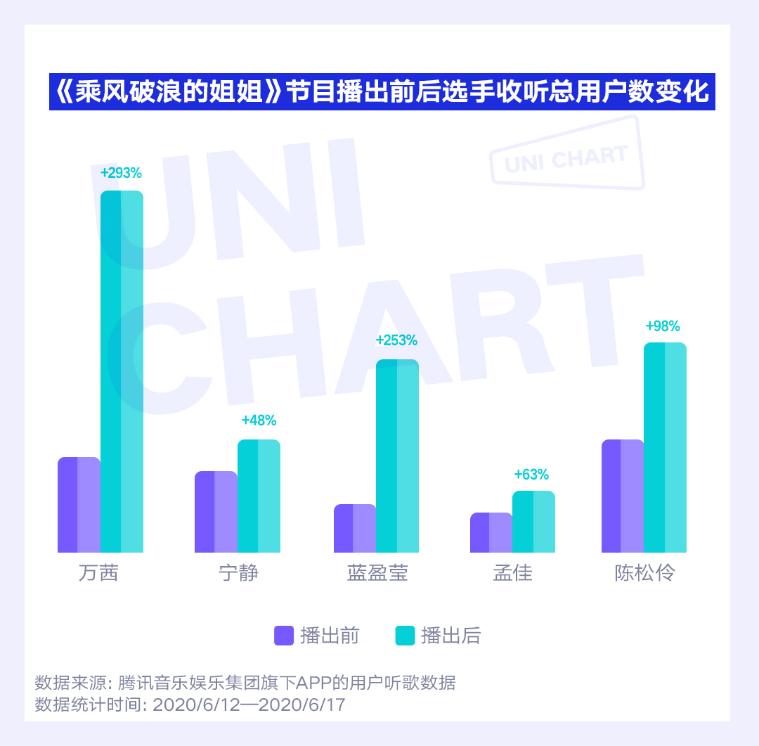 播出后两天,总听歌用户数增长最多的女艺人是万茜,涨幅高达293%,其中万茜男性用户增长10.45%,23-30岁用户涨幅8.96%。一改过去万茜偏年轻女性用户为主的收听情况。