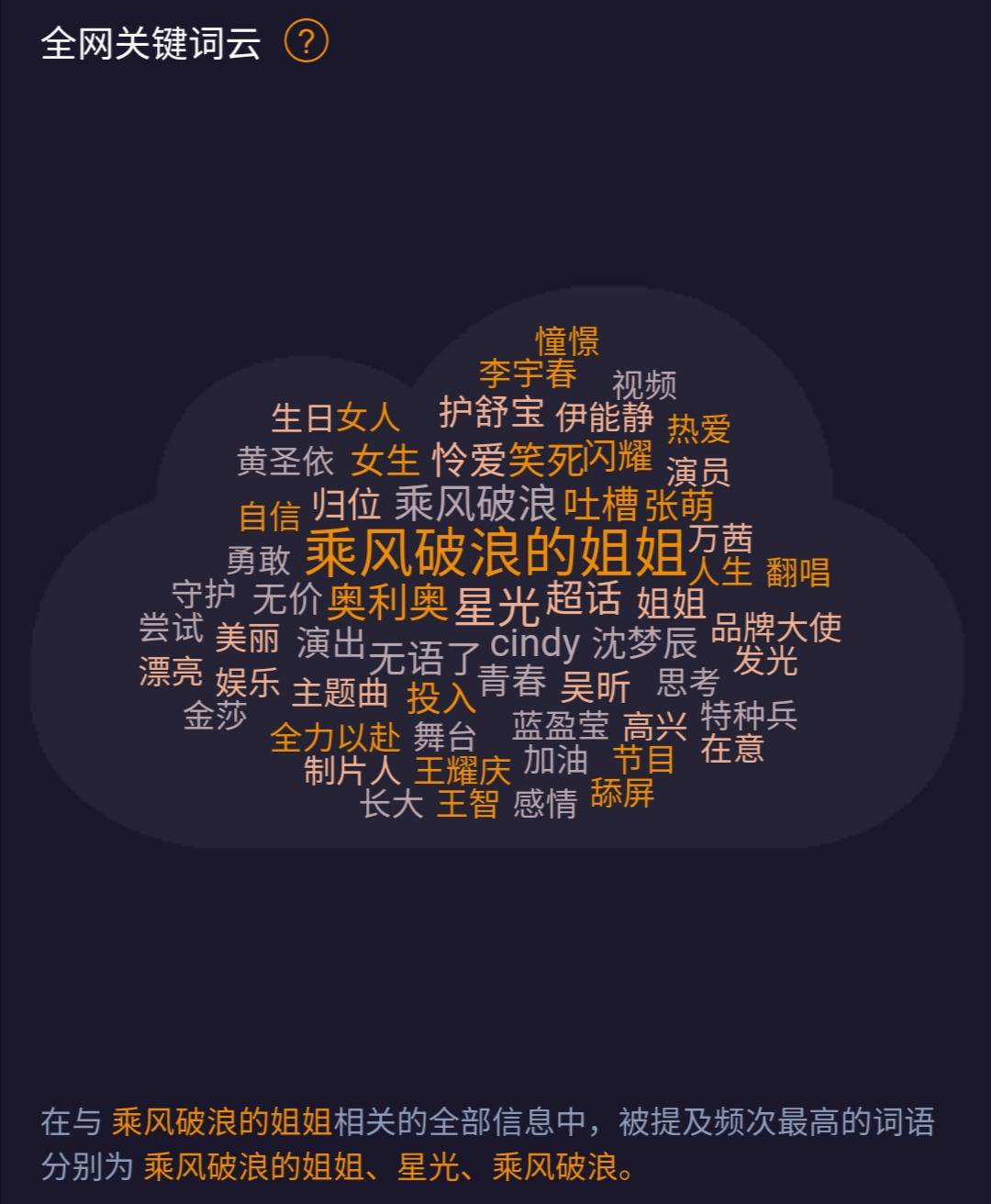 在#乘风破浪的姐姐#微博全网关键词云中可以发现,除了娱乐向词频外,美丽、漂亮、无价、勇敢、自信、全力以赴、舞台等「实力向」关键词,构成了观众对于这档节目的初始印象。