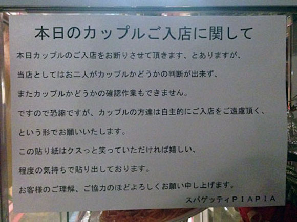 这家位于东京都八王子市的“意面piapia”在窗前贴出一张海报,称为了员工的心理健康着想,平安夜拒绝情侣入内。