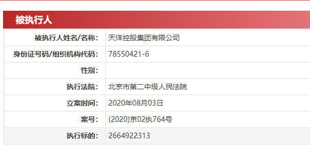 值得一提的是,中国执行信息公开网显示,天洋控股被北京市第二中级人民法院列为被执行人,执行标的约为26.65亿元。
