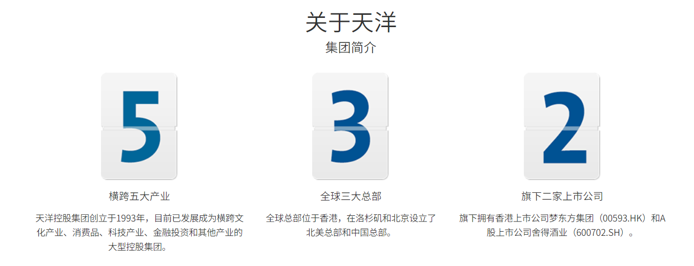 另据雷达财经了解,天洋控股创立于1993年,是一家横跨文化产业、消费品、科技产业、金融投资和其他产业的大型控股集团。全球总部位于香港,在洛杉矶和北京设立了北美总部和中国总部。目前公司旗下拥有在港股上市的梦东方集团和A股上市公司舍得酒业。