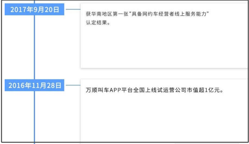 官网资料“公司发展历程”一栏显示,万顺叫车在2016年市值超1亿,2017年,市值就达到了200多亿。次年的相关采访中,又有司机表示公司市值已达500亿,最终目标是市值3000亿。