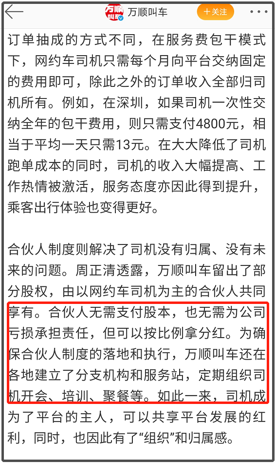 然而,在万顺叫车的官方微博中有一篇题为《专访万顺叫车创始人周正清:用合伙人制度重塑网约车格局,助推行业健》(可能由于编辑失误,题目不完整)的文章中提出: