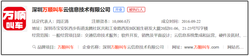 国家企业信用信息公示系统(广东)显示,深圳万顺叫车云信息技术有限公司成立于2016年9月22日,注册资本10000万元(未实缴),法人代表周正清。该公司在2020年1月13日被深圳市宝安区人民法院列为被执行人。