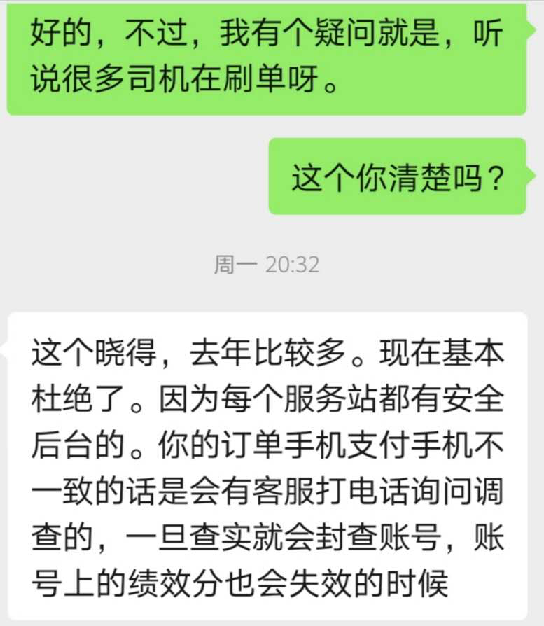 该合伙人表示,每个服务站都有安全后台,如果订单手机与支付手机不一致的话,会被查到,届时可能会被查封账号,绩效分也会失效。