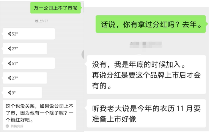 经理却表示,上不了市也没关系,因为还可以分红。然而当记者询问其他合伙人是否有得到过分红时,该合伙人说:“分红要品牌上市后才有。”