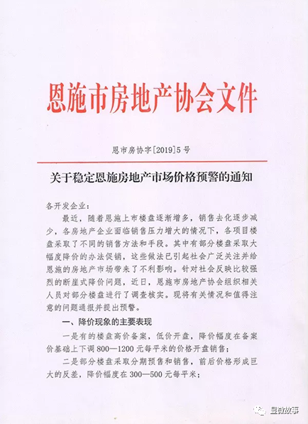 结果2019年6月,恩施市房地产协会发布了价格预警:有许多楼盘出现了降价促销的情况。