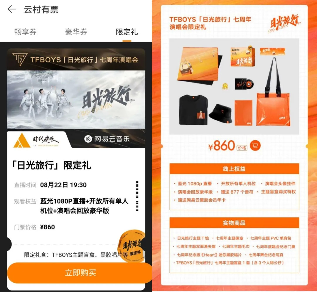这是毋庸置疑的国内线上演唱会最高票价。消费者支付860元获得的权益中,包含蓝光1080P直播,开放所有人单人机位,演唱会回放豪华版,以及售价280元的T恤、渔夫帽套装;168元的PVC单肩包礼品;159元的七周年纪念版本《Heart》mini黑胶唱片及写真;以及TFBOYS成员公仔的盲盒购买资格(购买盲盒需要另外支付99元)。