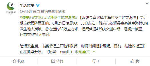 雅安市人民政府新闻办公室官微消息,受近期连续强降雨影响,8月21日凌晨03:50分左右,雅安市汉源县富泉镇中海村6组发生地灾滑坡,总方量约80万立方米,造成省道435线交通中断;经初步核查,目前有3户9人失联。