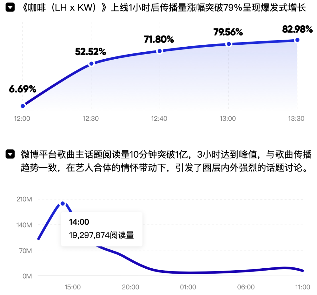 以歌曲《咖啡(LH x KW)》为例,作为Q2季度最高由你指数合作歌曲,在鹿晗与吴亦凡两位人气歌手的联手演绎下,上线一个半小时即空降由你音乐榜TOP1,成为本年度传播速度最快的合唱歌曲。同时,人气歌手之间的强强联合,让歌曲在社交平台上具备了破圈传播的话题价值,成为2020年具有典型意义的合作歌曲案例。