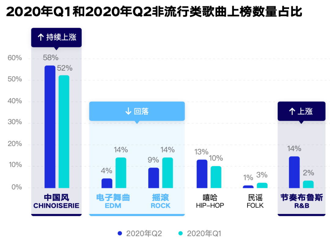 从Q2非流行类上榜新歌来看,国风延续了前几个季度遥遥领先的态势,在上榜歌曲中的占比接近60%。