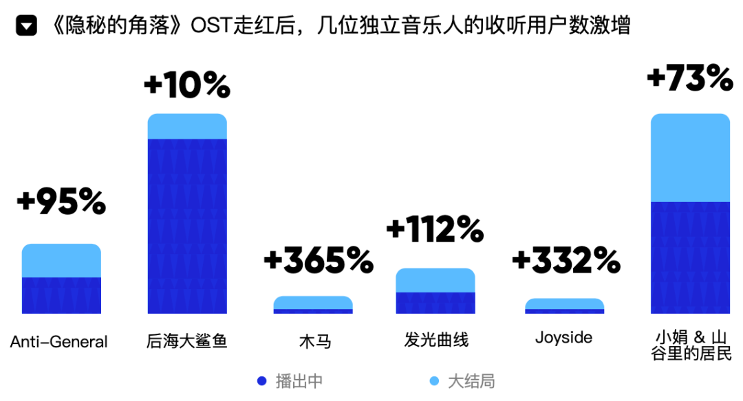 其中,《隐秘的角落》OST的走红也体现了影视作品与独立音乐合作巨大的发展空间。该剧集走红的同时,推动了多位独立音乐人收听用户激增。其中木马乐队和Joyside在该剧走红后,收听用户数的增幅超过了300%。