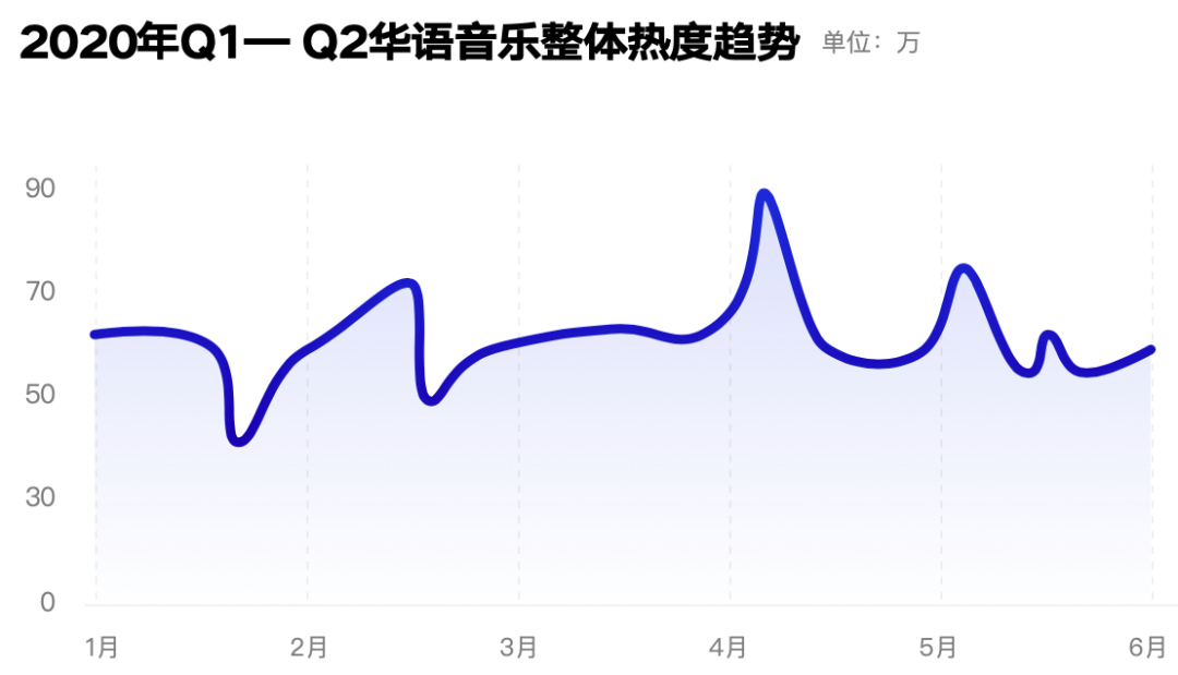 进入Q2以后,疫情对于音乐行业的影响逐渐降低。从华语音乐整体的热度趋势来看,得益于部分人气歌手新作的发行,多档音乐泛娱乐综艺的上线,各平台线上音乐内容的深入拓展,Q2华语乐坛的活跃度维持在了一个较Q1更为稳定的状态,几首爆款歌曲在不同的时间点带动了乐坛整体热度的上升。