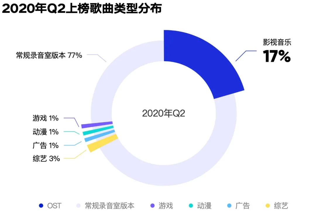 受到疫情对影视行业的冲击,影视音乐整体在Q2的热度仍呈下降趋势,音乐作品主要集中在影视剧,电影OST较少。但从华语音乐整体来看,除了常规录音室作品,影视音乐的热度仍明显高于其他类型。