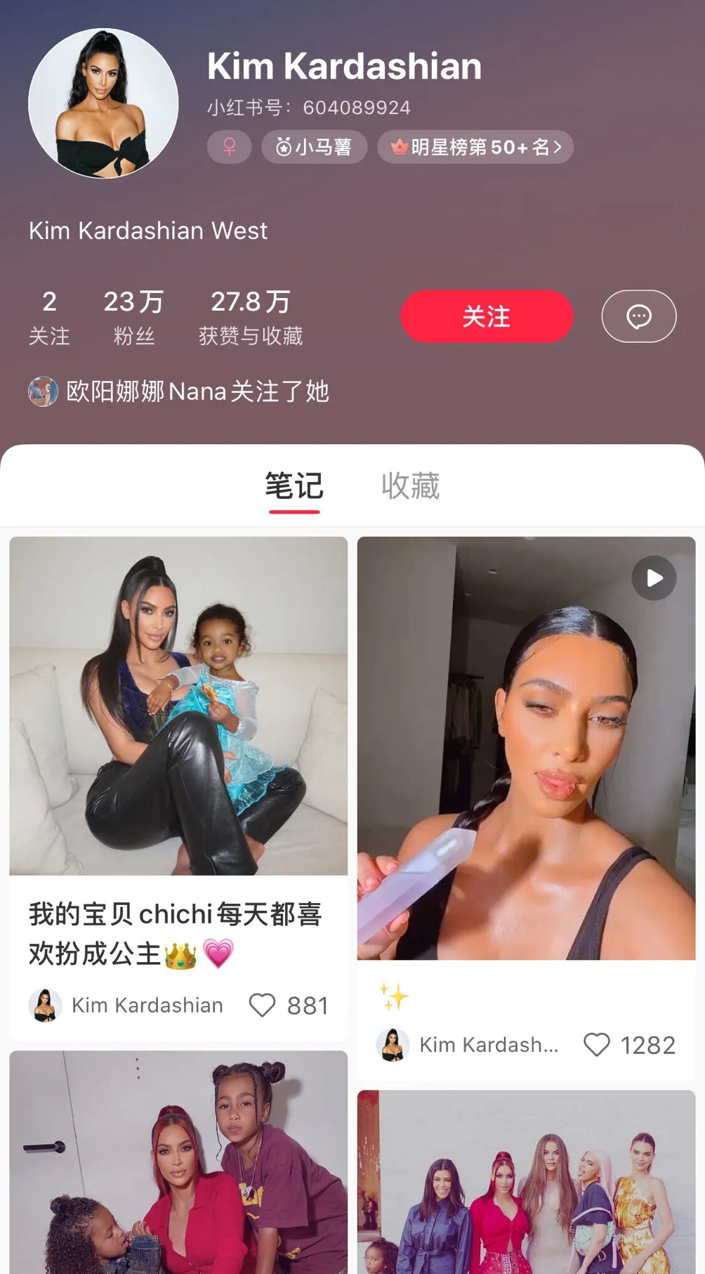 记者搜索发现,现在Kim Kardashian的个人账号在小红书粉丝已经达到23万,获赞和收藏数27.8万,最近在8月14日更新的笔记点赞数达到871,并获得小红书的明星认证。微博粉丝也有将近23万人关注,但是微博更新已经在去年停留。