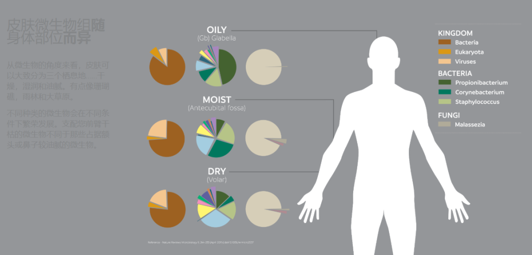 欧莱雅集团在2017年发布的研报《An Eye on Research》显示,人体表面的皮肤面积大约为1.8平方米,每平方厘米的面积上大约有100万个细菌。皮肤上存活着两种菌群:常驻菌群数量和分布稳定;暂时菌群是环境变化带来的微生物群。