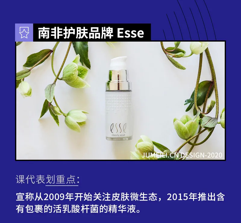 Esse在拉丁语中的意思是“要”,该品牌最初在南非新生的有机护肤市场中立足。2009年,Esse开始涉足益生菌护肤品。人类微生物组计划的早期发现开始改变了人们对皮肤的传统看法,Esse开始将皮肤视为人类和微生物细胞的生态学,并且开始将这种新观点纳入其产品配方。