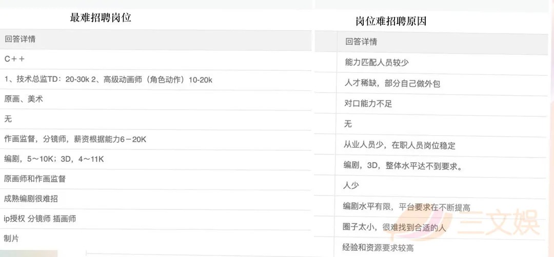 在这次的问卷调查中,我们也询问了“最难招聘的岗位及原因”,得到了动画公司HR直接的回复。