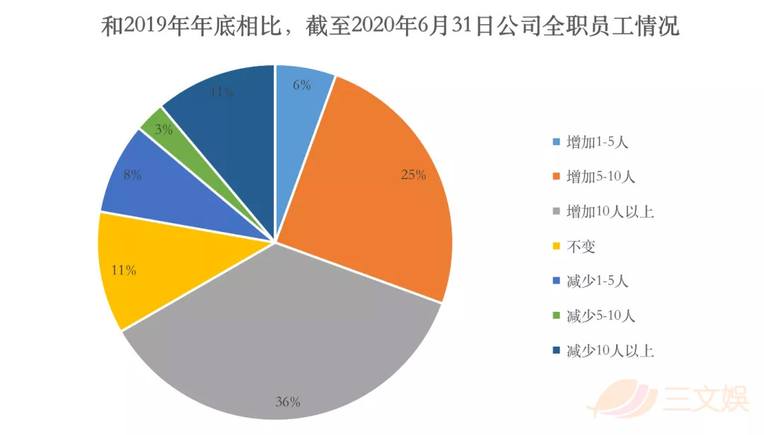 此外,同比2019年上半年,66.67%动画公司在调查中表示,全职员工数量有所增加。其中,增加了10人以上及5-10人的公司占比分别为36.11%和25%。