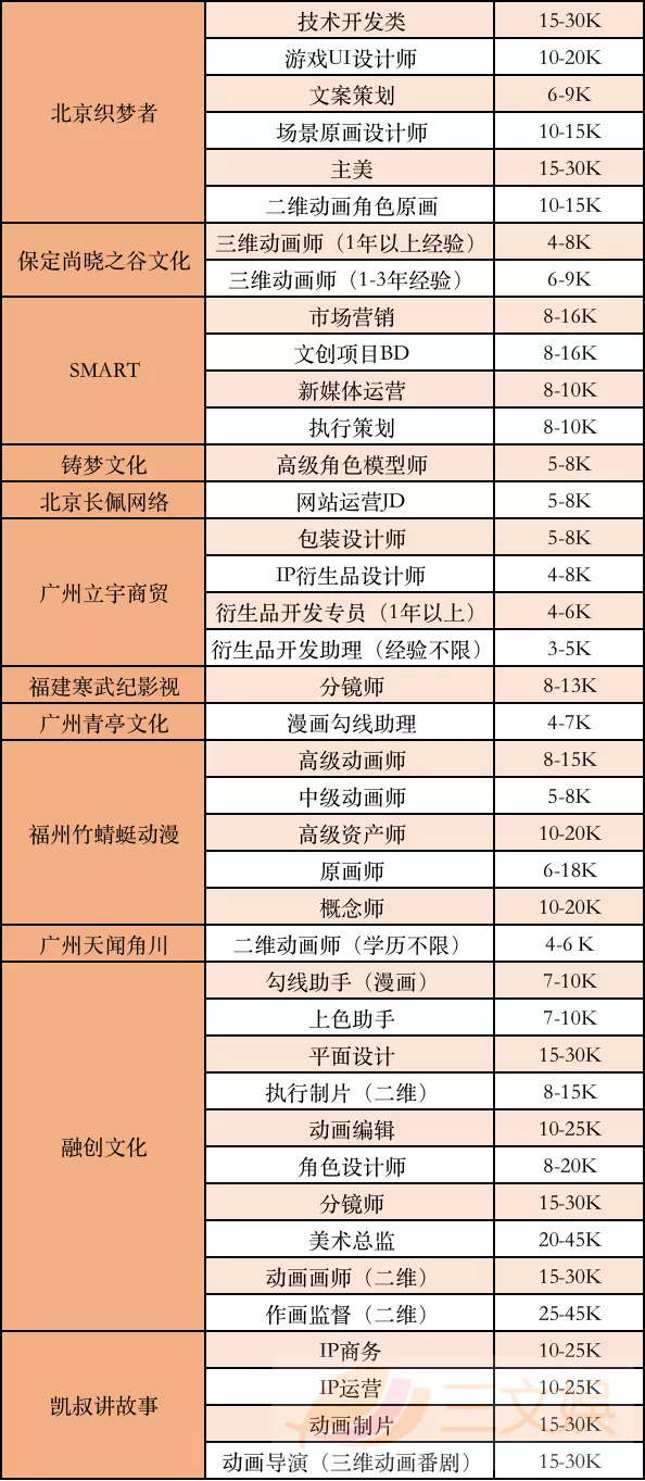 这时候我们会发现,与2016年、2017年、2018年及2019相比,动画内容制作公司一直在高薪求人才,但结果往往是“一将难求”。比如,作画监督。融创文化在这个岗位给出的薪资区间达到了25-45K。