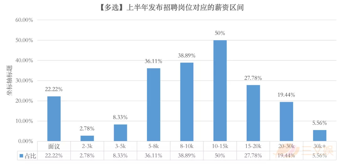 在36份有效调查问卷中,薪资区间在10-15K的岗位数量占比达到了50%。而且,有27%、19.44%和5.56%的公司,分别在招聘时挂出了月薪资在15-20K、20-30K、30K以上的岗位。