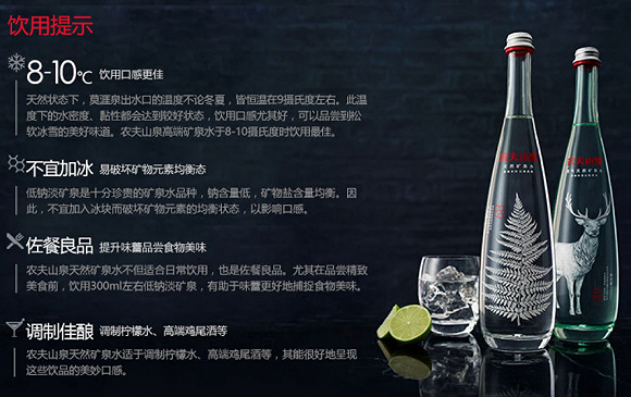 与此同时,农夫山泉在产品上也顺应气泡水占据喝水鄙视链顶端的市场事实,推出无气泡和有气泡两款,并开始尝试进入高端餐饮渠道。根据界面新闻报道,2015年初,农夫山泉在T8、外滩源壹号等上海12家高端餐厅进行产品投放,这些餐厅的人均消费在300至600元不等。农夫山泉还邀请餐厅大厨对水进行品鉴,并让他们给出佐餐建议。在农夫山泉的商品介绍页,也开始面向消费者介绍最佳饮用口感和适配的饮用场景。但在佐餐这条路子上,已有圣培露、普娜等强势的竞争者,农夫山泉胜算几何还不好说。