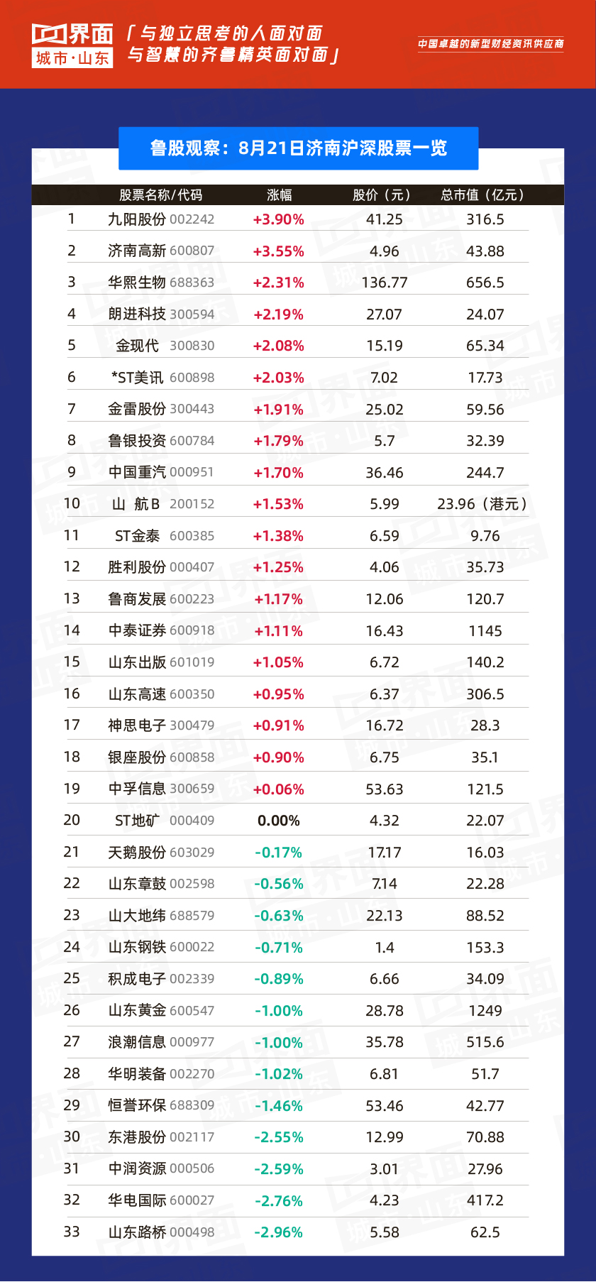 济南市涨幅榜首:九阳股份(002242),涨幅3.90%,股价41.25元,总市值316亿元;